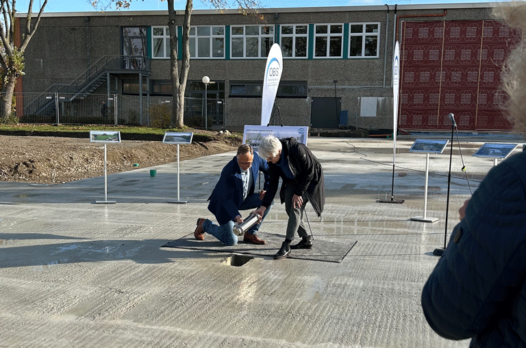 Beitragsbild: Landrätin Christiana Steinbrügge und Schulleiter Stefan Marken ließen die Zeitkapsel in den Boden. Fotos: Laura Schmalstieg