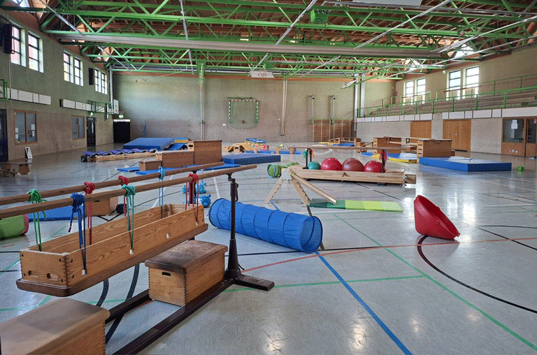 Parallel dazu war in der Halle eine große Bewegungslandschaft aufgebaut, mit Kletter- und Springstationen, einem Trampolin, Barfußpfad und umgebauten Turngeräten wie einer Riesenschaukel.